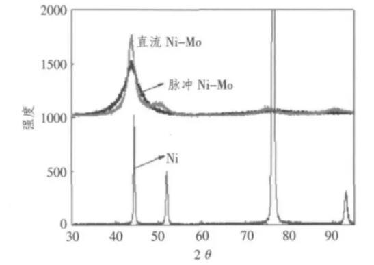 XRD不僅能反映物種和結晶學信息,而且還能利用其測定催化劑晶粒尺寸大小。本實驗中采用RIGAKU公司生產的D/max 2500 v/PC型自動X射線衍射儀觀測脈沖電沉積和直流電沉積制備的Ni-Mo合金電極,并根據Scherrer公式計算晶粒子的大小。