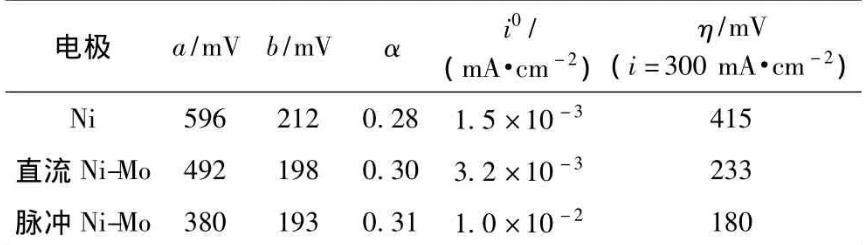 表2中所列出的過電位η是在電流密度i=300 mA·cm-2時由極化曲線得到的。可以看出,直流Ni-Mo合金電極在電流密度為300 mA·cm-2時比Ni電極降低182 mV,而脈沖Ni-Mo合金電極比直流情況下又降低了53 mV。這一結論和上面的析氫動力學參數的分析結果吻合。由此看出Ni-Mo合金電極在降低能耗方面有著較大的優勢,而脈沖電沉積制備Ni-Mo合金電極可以作為鎳鉬合金電極研究中的一個重要方向。