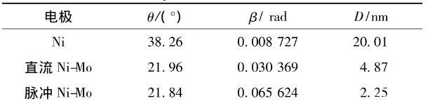圖3為不同電極時的XRD衍射譜圖。從XRD圖可以看出,Ni-Mo合金鍍層的衍射曲線與Ni的完全不同,說明Ni-Mo合金電沉積過程中形成了不同于Ni的物相結構。對比直流電沉積和脈沖電沉積Ni-Mo合金鍍層可以發現,脈沖電沉積Ni-Mo合金的XRD衍射峰更進一步寬化,說明鍍層的晶粒進一步細化。由Scherrer公式得到晶粒尺寸大小見表4。