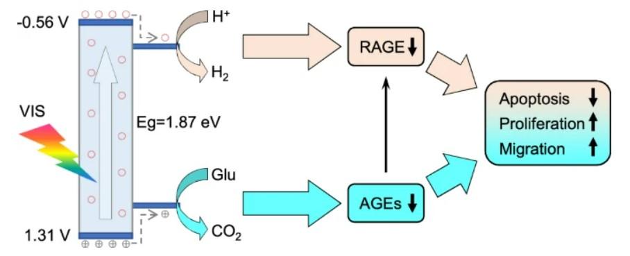 糖尿病足潰瘍(DFU)是糖尿病最常見的慢性并發(fā)癥之一,常伴有長期炎癥、自主神經(jīng)異常和細菌感染,使糖尿病創(chuàng)面難以愈合。高糖微環(huán)境在糖尿病創(chuàng)面的發(fā)生和進化過程中起著重要作用。通常高糖微環(huán)境會促進糖基化,導(dǎo)致一系列副作用,包括慢性炎癥和血管損傷。氫分子已被證明是一種安全有效的抗炎劑,可改善缺血-再灌注損傷,激活皮膚細胞,促進傷口愈合。提出利用腫瘤、關(guān)節(jié)炎等疾病微環(huán)境中的還原性化學(xué)因子作為人工催化劑的犧牲劑,通過光催化途徑實現(xiàn)可持續(xù)的、可控的制氫,以提高氫治療的療效。近紅外(NIR)光催化有利于深部疾病的氫治療,但近紅外介導(dǎo)的光催化制氫效率普遍遠低于紫外光(UV)和可見光(VIS)。與NIR光催化相比,VIS光催化制氫更適用于糖尿病創(chuàng)面等淺表疾病的治療。