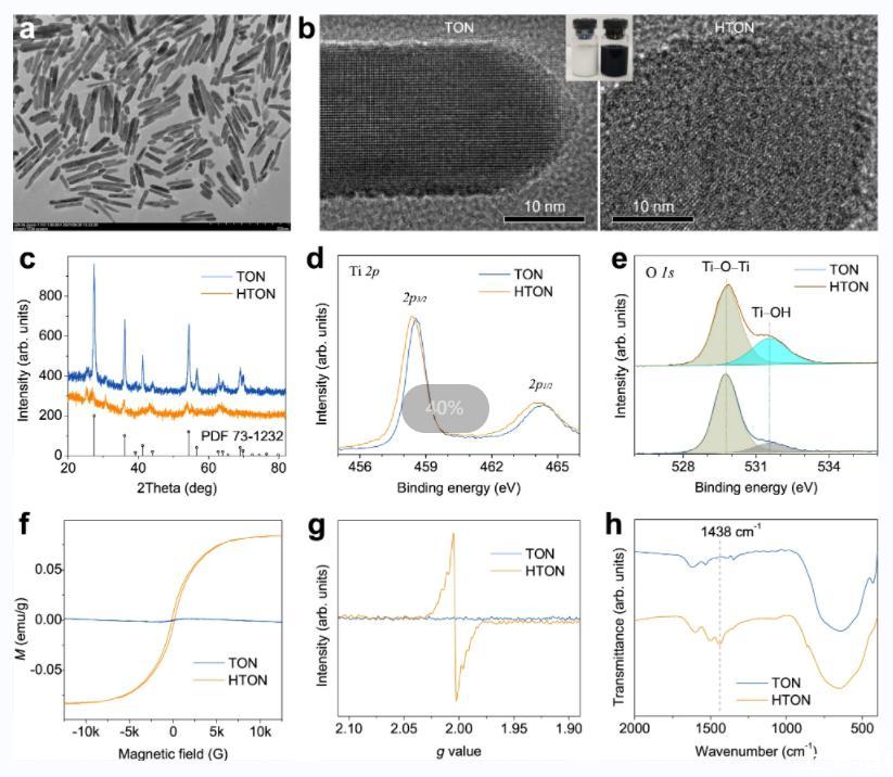 圖2、HTON納米催化劑的形貌、組成和尺寸表征。HTON的TEM圖(a)、HR-TEM圖(b)、XRD(c)、XPS圖(d,e)、VSM圖(f)、EPR譜(g)、FTIR譜(h)。a、b的實驗獨立重復(fù)了三次,結(jié)果相似。