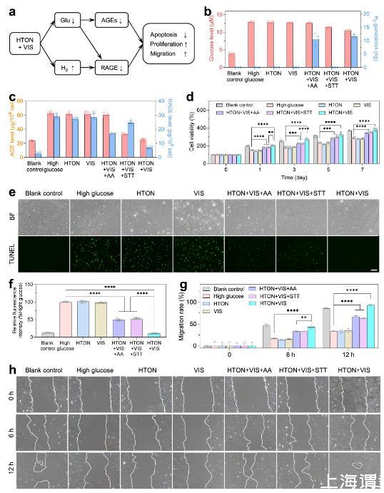 圖4、基于葡萄糖消耗和產(chǎn)氫的光催化治療的體外效應(yīng)和機制。VIS光催化治療糖尿病創(chuàng)面的機制示意圖(a),細胞內(nèi)VIS光催化H2生成和葡萄糖消耗(n=3個生物獨立樣本)。(b),體外細胞培養(yǎng)3天后晚期糖基化終產(chǎn)物(AGEs)(n=5個生物獨立樣本)及其受體(RAGE)(n=4個生物獨立樣本)的表達。(c),vis光催化治療對HMEC-1細胞增殖(n=4個生物獨立樣本)。(d)、凋亡(n=3個生物獨立樣本)(e,f)和(g,h)遷移(n=3個生物獨立樣本)的影響。采用TUNEL(末端脫氧核苷基轉(zhuǎn)移酶介導(dǎo)的dUTP缺口末端標(biāo)記)試劑盒中的熒光素標(biāo)記三磷酸脫氧尿苷(dUTP-fitc)對e)細胞凋亡細胞進行綠色熒光成像。通過在h細胞邊緣繪制白線來識別不同處理時間后的細胞遷移情況。l-抗壞血酸(AA)和四硫酸鈉(STT)作為單個氫的空穴犧牲劑和電子犧牲劑分別產(chǎn)生和消耗葡萄糖。
