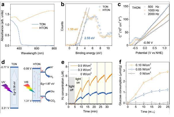 圖3、HTON納米催化劑制氫和耗糖的能帶結(jié)構(gòu)和vis光催化行為。紫外-可見吸收光譜(a),xps測定的TON和HTON的最高占據(jù)分子軌道(HOMO)水平(b),HTON的Mott-Schottky圖(c),TON和HTON的能帶結(jié)構(gòu)(與正常氫電極(NHE))以及vis光催化制氫和消耗葡萄糖的機理示意圖(d),在不同功率密度氙燈照射下,HTON納米催化劑在葡萄糖水溶液(20 mM)中的vis光催化制氫(e)和葡萄糖消耗(f)行為(n=3個生物獨立實驗)。