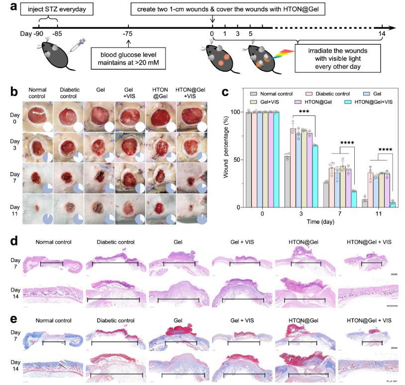 圖1、基于HTON的可見光觸發(fā)光催化治療糖尿病創(chuàng)面機理示意圖。