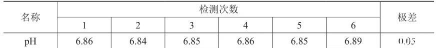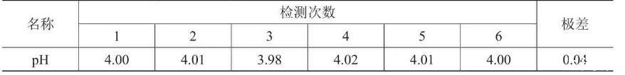1.重復性:取經中國計量科學研究院檢定合格的瓶裝pH標準物質配置成pH為4.00(25℃)標液分別檢測6次,記錄檢測值(見表1)。