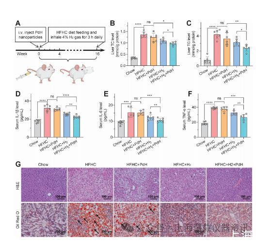 圖4、PdH注射加氫氣吸入預防輕度NASH的治療效果。輕度NASH預防(A)、肝臟總膽固醇(B)和甘油三酯(C)含量、涉及IL-1β(D)、IL-6(E)和TNF-α(F)的全身炎癥水平的治療程序,以及治療結束時肝切片的H&E和油紅O染色(黑色箭頭指向代表中性甘油三酯和脂質的紅點)圖像(G)。