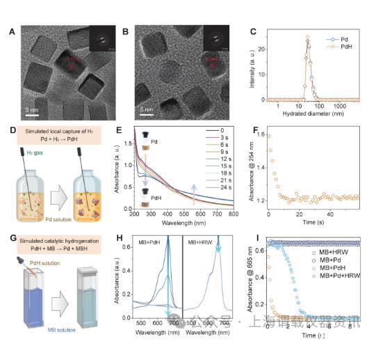 圖2、Pd納米粒子的尺寸表征、氫捕獲和催化氫化特性。PdH(A)和Pd納米粒子(B)的HR-TEM圖像(插入圖像是相應的選定區域電子衍射圖)、它們的水合直徑分布(C)、模擬的局部氫捕獲圖(D)和相應的紫外吸收演變(E)用于監測動態過程(F),模擬催化加氫圖示(G)和相應的UV吸收演化(H)用于監測動態過程(I)。