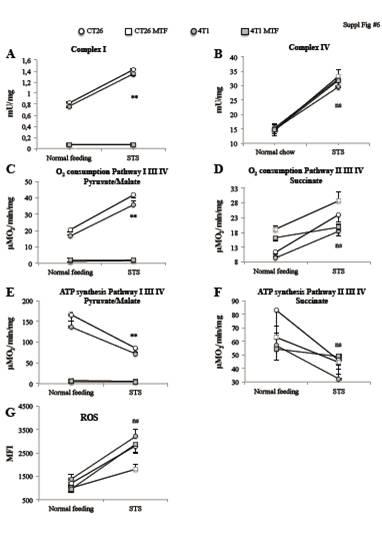 圖2、老鼠體內(nèi)癌細(xì)胞進(jìn)行線粒體呼吸鏈系統(tǒng)的過(guò)程。其中○(CT26細(xì)胞)□(CT26+MTF)●(4T1)■(4T1+MTF)圖A、B表示的含有不同癌細(xì)胞的老鼠體內(nèi)生成的線粒體呼吸鏈復(fù)合物Ⅰ和復(fù)合物Ⅱ的量變化。圖C、D表示的是細(xì)胞進(jìn)行線粒體有氧呼吸時(shí),其線粒體呼吸鏈過(guò)程中氧氣的消耗速率的變化情況。圖E、F表示的是細(xì)胞進(jìn)行線粒體有氧呼吸時(shí),其線粒體呼吸鏈過(guò)程中ATP的變化情況,圖G是表示這個(gè)過(guò)程中活性氧的變化情況。