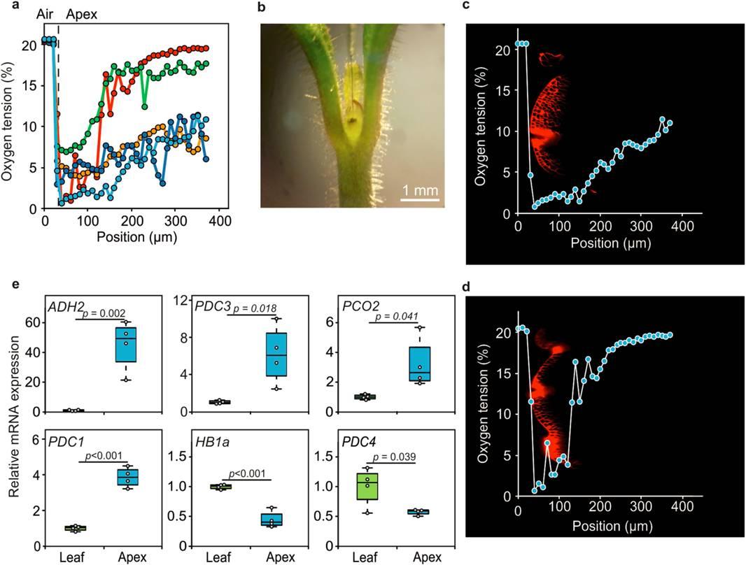 圖1、植物的莖尖分生組織(SAM)活性的保持需要一個低氧生態區域。圖a表示的是通過微電極沿植物莖尖組織的頂頭方向測試SAM區域的氧濃度變化,圖中的顏色代表的是單次測試。圖b表示的是擬南芥花序分生組織中GFP的表達受缺氧反應啟動子(pHRPE)的驅動。圖c表示的是在常規氧條件下和高氧條件下生長的植物的表現。圖d表示的是在常氧和高氧條件下生長的擬南芥葉片起始速率.