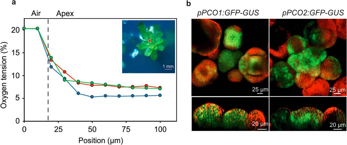 圖4、a)使用氧氣微電極穿刺入5周齡的擬南芥的植株的花序分生組織處的氧濃度剖面,其中微電極是從植物莖尖的頂端到基部的區域插入的。插圖顯示了微傳感器插入植物花序分生組織內的實驗裝置照片。圖b表示的是pPCO1:GFP-GUS和pPCO2:GFP-GUS對缺氧有特異性反應的研究,pPCO1:GFP-GUS被轉化為植物的花序和花分生組織中的綠色熒光信號。