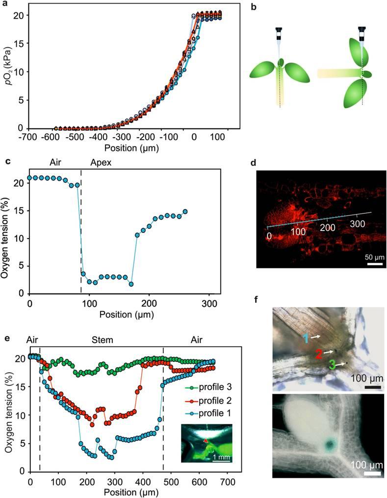 圖2、擬南芥與植物莖尖處的低氧水平區域。圖a表示的是空間分辨率比較以及使用的定制克拉克式微傳感器(尖端為3微米)(紅色,橙色和粉色三角形)與商業可用的傳感器OX10,Unisense A/S(青綠色、青色和鈷藍色圓圈)圖b表示的是測量植物莖尖處組織內的氧氣濃度曲線的實驗裝置示意圖。(左):從頂部到基底方向(左)和徑向方向(右)。圖c表示的是生長了四天的擬南芥幼苗頂端氧濃度分布。圖d表示的是對應圖c中的氧剖面重建后的傳感器插入模式的跟蹤示意圖。圖e表示的是將克拉克型微電極插入生長七天的擬南芥的SAM處組織的橫向不同位置處獲得的氧濃度剖面。莖尖區域(剖面曲線1),子葉血管系統的交界處(剖面曲線2)和接口處以下(剖面曲線3).圖f表示的是通過光學顯微鏡確定微電極的插入點的位置。