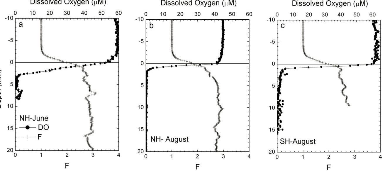 圖5、(a)6月份在NH區域位置的沉積物的原位測試的O2濃度剖面;(b)8月NH區域位置的沉積物的原位測試的O2濃度剖面。(c)8月份的SH區域位置的沉積物的原位測試SH區域O2濃度剖面圖。