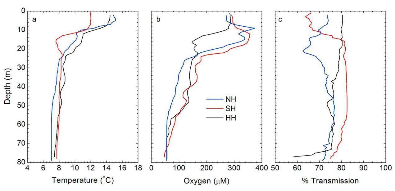 圖2、使用渦動系統測試的俄亥俄岡大陸橋區域不同區域位置的剖面濃度分布情況。圖(a)表示的是其溫度剖面分布圖;圖(b)表示的是溶解O2剖面分布圖;圖(c)表示的是從三個研究地點百分比傳輸對比情況。