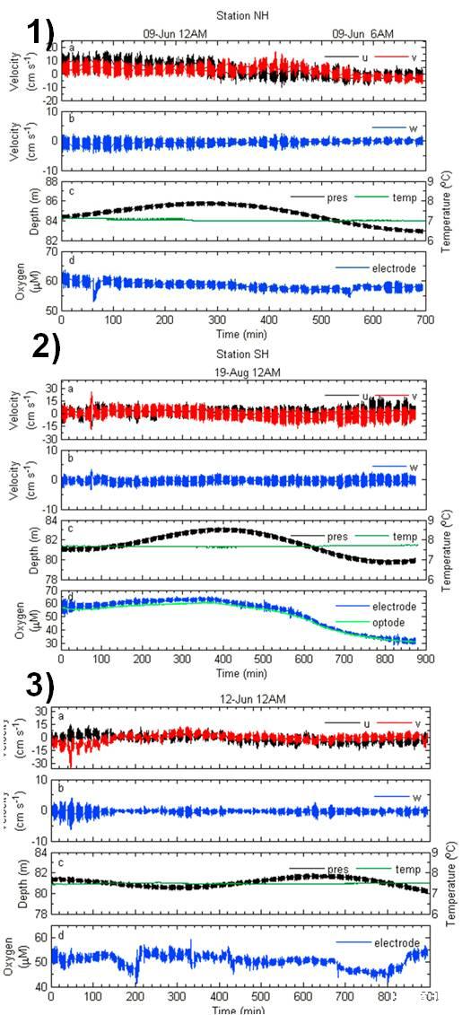 本研究提供關于沉積物耗氧速率,使用了渦動(unisense渦動系統)設備和一個新的著陸器設備的(BOXER)結合,通過船將設備部署船用于海洋大陸架,用于海洋大陸架底部環境調查。2009年6月,當著陸器設備從俄勒岡州中部區域進入到水底80米深度處,表面波(峰值期為TP16秒)對垂直速度和氧氣變化的影響非常明顯,然而在2009年8月,表面波值要短得多,因此測量到的變化主要是渦流造成的。采用三種消除趨勢方法(線性、居中移動平均數、低通頻率濾波器)進行比較,當數據突發持續時間類似于重要的非湍流運動例如內部波,得出采用線性去趨勢方法是有效率的。但是如果今后的研究中收集的是較長的數據突發或連續記錄時,低頻濾波器設置為消除長期波動將具有在更精確地定義包含在EC(渦動)系統中的動態過程中的頻率方面的優勢。此外,壓力變化記錄結果有利于確定坐標旋轉角度,盡量減少垂直速度分量與波的水平分量的污染。測定的渦動(EC)O2通量范圍在3~10 mmol m-2 d-1,底棲室的O2通量的測量一式兩份,分布在兩個區域之間,測試的通量值為4~8 m-2 d-1。所有的氧通量值都太低,這意味著在過去十年中,俄勒岡大陸架底棲邊界層的低氧情況較為普遍,這也是由于局部成巖作用的加強導致的。然而局部損耗率可能對一系列的局部變量很敏感,例如水的深度、內部混合動力學,底部水域的O2,泥沙滲透率,波紋系數、沉積物的有機質含量。
