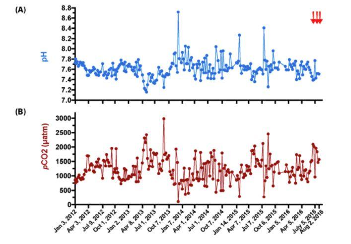 圖5、在收集白鱸幼體前的3.5年中,監控了白鱸幼體魚缸的水質。圖(A)顯示了pH值,圖(B)顯示了pCO2。右上角的紅箭頭標識了收集魚卵的日期。(A)pH和(B)pCO2。