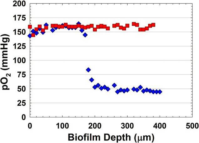 應用氧氣微電極傳感器測量體外培養的糖尿病(db/db)小鼠創面模型的生物膜的橫斷面氧分壓濃度,結果表明小鼠痂內創面的氧分壓含量較高,在活的老鼠的體內出現一個陡直氧的的梯度濃度范圍從17到72毫米汞柱之間。被安樂死的老鼠身上氧的濃度范圍為從6.4毫米汞柱到1.1毫米汞柱。小鼠痂內的氧梯度與體外培養的臨床分離株以及體外培養的人體標本相似。在同步對小鼠痂內的假單胞菌的代謝活動的特征進行了轉錄組學分析,結果表明細菌代謝活性相關的表達基因與細胞生長有關。轉錄組的結果也表明傷口內的細菌經歷了限氧應激效應。在體內表達的細菌基因是與細菌相關的是Anr介導的缺氧應激反應基因。其他細菌應激反應基因與靜止期生長相關的基因在體內高表達,滲透應力和RpoH介導的熱應激效應。這也說明細菌生物膜是能促進慢性傷口愈合是通過維持局部低氧張力,它們本身的新陳代謝活動則是通過補充消耗氧氣的細胞來完成宿主的防御過程。