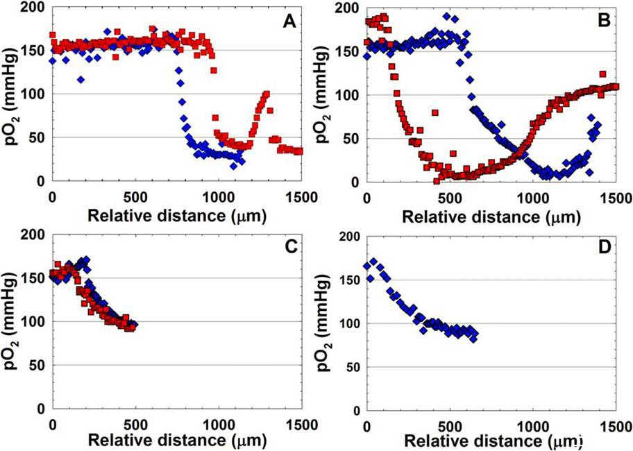 圖2、小鼠完整創面痂的氧濃度分布。傷后2天感染銅綠假單胞菌生物膜。深度標度為零是自行設定的,氧氣微電極傳感器測量開始于痂或傷口上方的空氣中,然后將微傳感器穿刺入痂或傷口中,氧濃度開始下降,因為微傳感器滲透到痂或傷口中。(A)兩種不同活鼠的傷口痂的氧濃度剖面圖。(B)兩只不同安樂死的小鼠傷口痂的剖面圖。(C)活鼠除痂后傷口氧的濃度剖面圖。(D)活老鼠背部新傷口的氧濃度剖面圖。創面痂表面具有與體外生物膜相似的氧梯度分布。