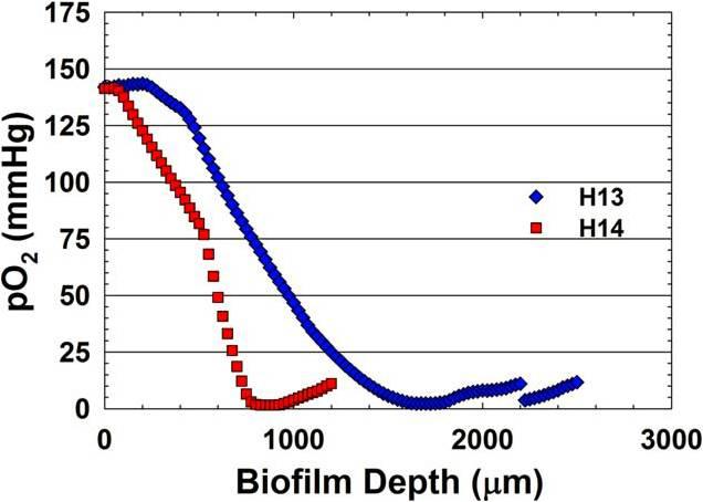 創傷傷口的局部氧濃度長期以來被認為是創傷愈合的一個重要參數。傷口附近的組織氧合與傷口愈合是呈正相關,而在無法愈合的傷口周圍的氧含量往往很低。而目前對生物膜與傷口延遲愈合有關生物膜會損害傷口愈合的機制尚不清楚。由于許多種類的細菌產生外毒素和外酶可能抑制傷口的愈合。由于傷口處存在的生物膜和反應的白細胞會消耗氧氣,這可能會阻礙傷口愈合,而傷口愈合本身又需要氧氣。本論文的研究人員使用了氧微電極傳感器用來測量通過體外培養的糖尿病(db/db)小鼠創面模型的生物膜氧的橫斷面進行了研究,試圖驗證假設細菌的生物膜的建立是否有助于維護傷口局部低氧張力。