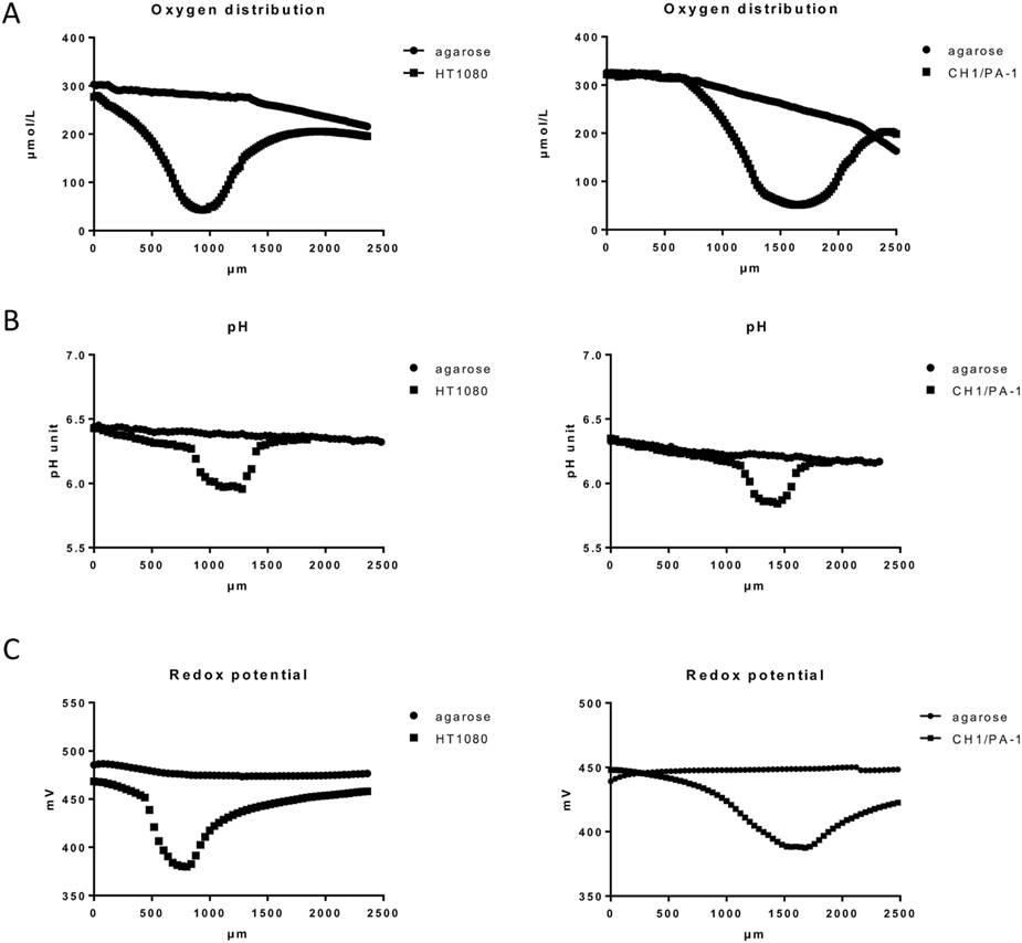 圖1、應用微電極對瓊脂糖包埋的HT1080細胞和CH1/PA-1多細胞球體(直徑大于400um),純瓊脂糖培養基測試的一些物理化學性質參數,其中圖A測試的是氧氣的分布情況(測量步徑為20um),圖B測試的是pH(測量步徑為40um),圖C測試的是氧化還原電位(測量步徑為40um)。從圖中可以看出,在培養基球體中心位置的氧氣濃度、pH、以及氧化還原電位均最低,而純瓊脂糖的氧氣濃度、pH則是呈現逐漸降低的趨勢。