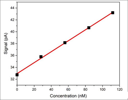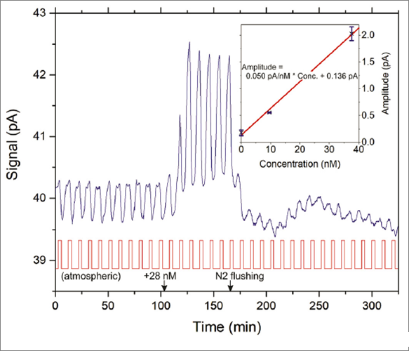 圖2、微電極信號跟蹤(藍線),在工作前180秒和400秒間隔(運行信號平均超過10秒)(運行信號平均10 s以上)。紅線顯示前護板打開(高)和關閉(低)的時間段。最初,將微電極浸入含有約9.6 nM一氧化二氮的氣泡水中。在100分鐘時,通過注入少量濃縮水將N2O濃度增加28 nM(總計37.6 nM)。在約170分鐘時,用N2鼓氣(0 nM N2O)。插圖顯示了極化開/關循環期間信號幅度相對于濃度的相應校準曲線,平均值為4個循環的平均值,并標出了標準偏差。