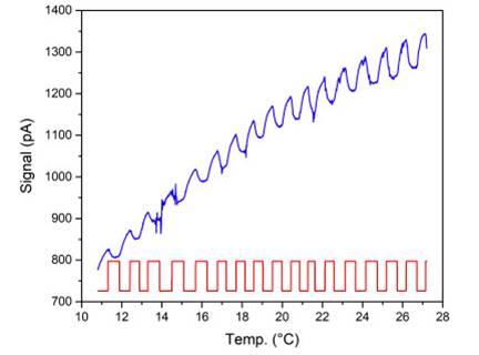 圖4、溫度從11°C穩定升高到27°C時,微電極信號(藍色,運行平均值為5 s,運行平均值為450 nM一氧化二氮),同時以與原位相同的頻率切換(紅色)。該微電極已使用了4個月,與新制造的微電極相比,零信號已增加了約40倍。從圖4所示的溫度校準數據可以看出,用了四個月的微電極的零信號在室溫下以相對較高的噪聲水平增加了40倍,達到1000 pA以上。