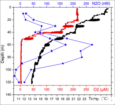 圖5、墨西哥西部ETNP區域上部120 m(1740.99 N,10221.02W,底部深度1040 m)的N2O深度剖面于2018年4月15日通過可切換的N2O微電極(藍星)現場測量),然后通過氣相色譜法對回收的水樣進行處理(藍色圓圈)。另外,繪制了溫度(黑色)和O 2(紅色,平均1s)的數據。