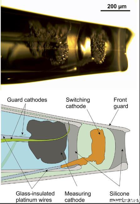 圖1、可切換N2O微電極的照片及相應的原理圖??汕袚Q的一氧化二氮微電極(圖1)的構造步驟與STOX微電極相同。將前保護陰極鍍在涂覆有特氟隆的0.025mm鉑-銥線的裸露金屬尖端上。鉑-銥的使用提供了更高的機械強度,與最初描述的STOX微電極相比,聚四氟乙烯涂層的柔韌性大大提高了抗機械沖擊性