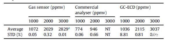 圖5、克拉克型微電極氣體傳感器、商業(yè)化紅外線型其他分析儀和氣相色譜之間的比較。測試的一氧化二氮氣體混合物的大約濃度為1000、2000和3000 ppmv。從表中可以看出,微電極氣體傳感器相比于另外兩種測試方法,具有更高的準確度,尤其是當氣體混合物中氧化亞氮的濃度越高,其差別越大。