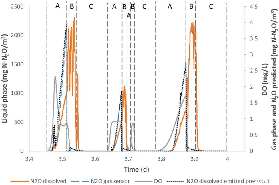 圖4、污水處理廠典型的SBR序批式反應器中N2O氣體排放濃度(藍色虛線)、液體中的N2O濃度(橙色實線)、溶解的氧化亞氮濃度的預測(灰色線)和N2O溶解排放預測濃度(黑色虛線)(采用文獻5提出的方法)的典型SBR剖面圖。圖A是需氧階段,圖B缺氧階段,圖C沉降和沉淀階段。
