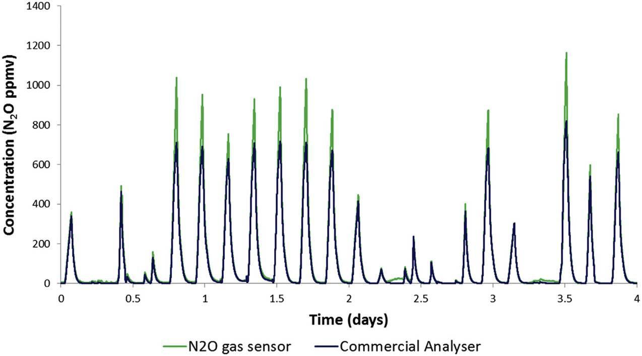 圖3、使用氣體傳感器(綠線)和商業(yè)紅外氣體分析儀(黑線)在一體化的SBR上進行4天的N2O排放監(jiān)測。從圖中可以看出,氣體傳感器比傳統(tǒng)的商業(yè)化的紅外氣體分析儀,能夠測試出混合氣體中較高濃度的氧化亞氮。