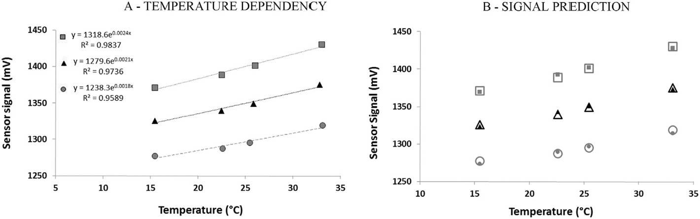 圖2、3種不同濃度的N2O氣體混合物(●0 ppmv;▲25.5 ppmv;■50.1 ppmv)下,在一定范圍內傳感器信號的指數變化作為溫度15-35度的函數。圖B表示的是實際測試的不同濃度的N2O氣體混合物時(●○0ppmv;▲△25.5 ppmv;50.1 ppmv■□),傳感器信號值(開口符號)與預測的傳感器信號值(封閉的符號)。從圖中可以看出,實測值與預測值基本一致。