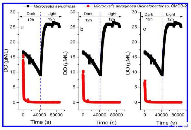 圖4、在不同密度的初始細菌培養體系中,微囊藻的和不動桿菌的培養體系環境中測試的氧濃度剖面分析圖。圖(a)表示的是含有不動桿菌菌屬和銅綠微囊藻FACHB905,其中CMDB-2生物量濃度是是1×103個細胞/毫升;(b)表示的是最初的不動桿菌菌屬,其中CMDB-2生物量是1×105個細胞/毫升;圖c表示的是最初的不動桿菌sp。CMDB-2生物量是1×107細胞/毫升。實驗是在受控實驗室條件下進行。在40umol光子/(m2·sec)和12 h/12 h(光/暗)周期內。