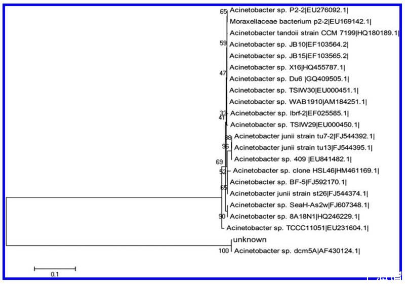 圖2、來自于國家生物技術信息中心基因庫分析的16S-rRNA序列的目標菌株與密切相關的細菌之間的系統關系。參考序列的數據庫加入數量在應變名稱后顯示。這些數字表明目前的引導支持是基于對1000個重新采樣數據集的鄰接分析。隔離帶的基因庫數量是KX928708。