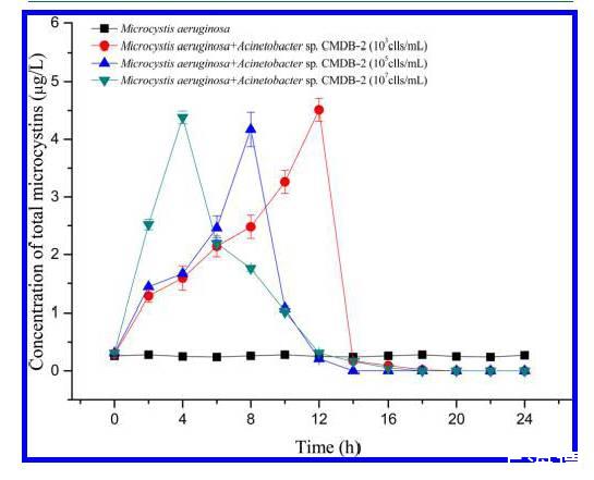 圖5、體系中含有不同的初始細菌密度條件下,微囊藻菌屬FACHB905動態MC-LR微囊濃度的和不動桿菌中的動態濃度變化。圖中顯示的數據代表了是實際測試值三倍的平均值。