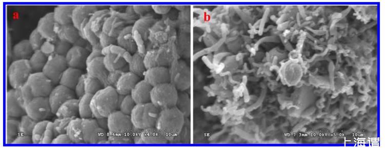 圖3、24小時后,在(a)參照對比組和(b)藻/細菌共培養系統中掃描電子顯微鏡圖像的微囊藻菌FACHB905和單一不動桿菌的掃描顯微鏡示意圖。