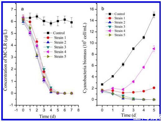 圖1、(a)MC-LR(微囊藻素)濃度和(b)細菌隔離實驗中微囊藻細胞密度的動態變化。數據代表是實際測試后三倍的平均值。